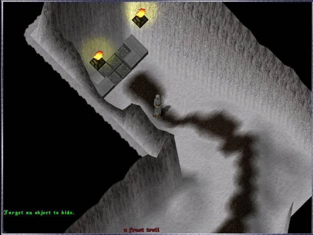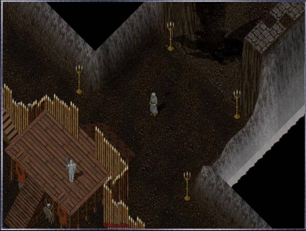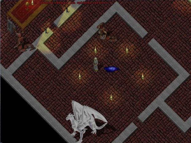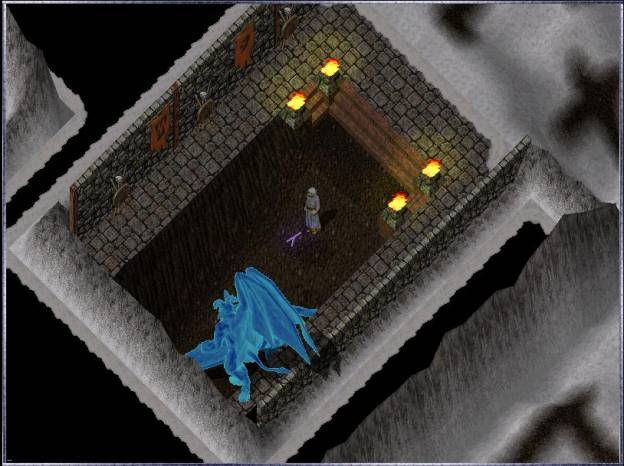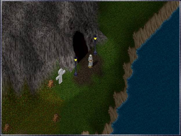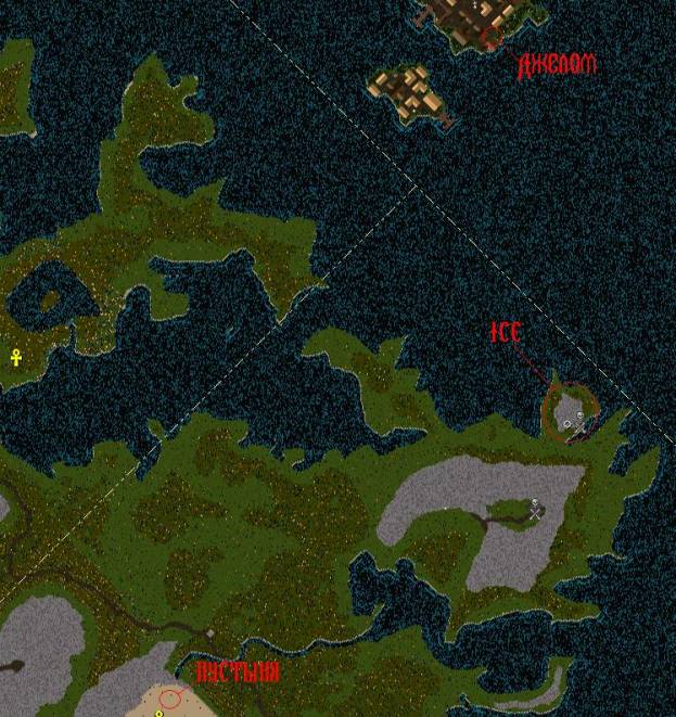 Добраться до Ледяного Подземелья проще всего из пустыни (пешком). Нужно всего лишь развернуться на север, и идти, никуда не сворачивая до тех пор, пока не увидите Белый Крест и вход в пещеру: ![]() Особых опасностей по дороге вам не встретиться, однако, путь будет долгим. Правда, существует и другой путь – море. В последнее время доступен он только состоятельным гражданам Британии – капитаны кораблей наотрез отказываються брать на борт пассажиров. Можно только нанять весь корабль, однако, это стоит немалых денег. (Несколько десятков тысяч золотых для неопытного искателя приключений – большая сумма). Однако, если у вас все же найдуться деньги на найм корабля, Ледяного подземелья вы сможете достичь, отплыв на юг из Джелома: ![]() Если за то время, пока вы читаете эти строки, вы добрались до входа в Подземелье – чтож, заходите. ![]() Около странной руны, похожей на букву Y , вас встретит стража - два ледяных демона. Как видно из рисунка, они ОЧЕНЬ рады вашему появлению. Если вы еще неопытны – лучше отступите. Для вас – демоны довольно опасные противники. В ином случае – идите вперед!